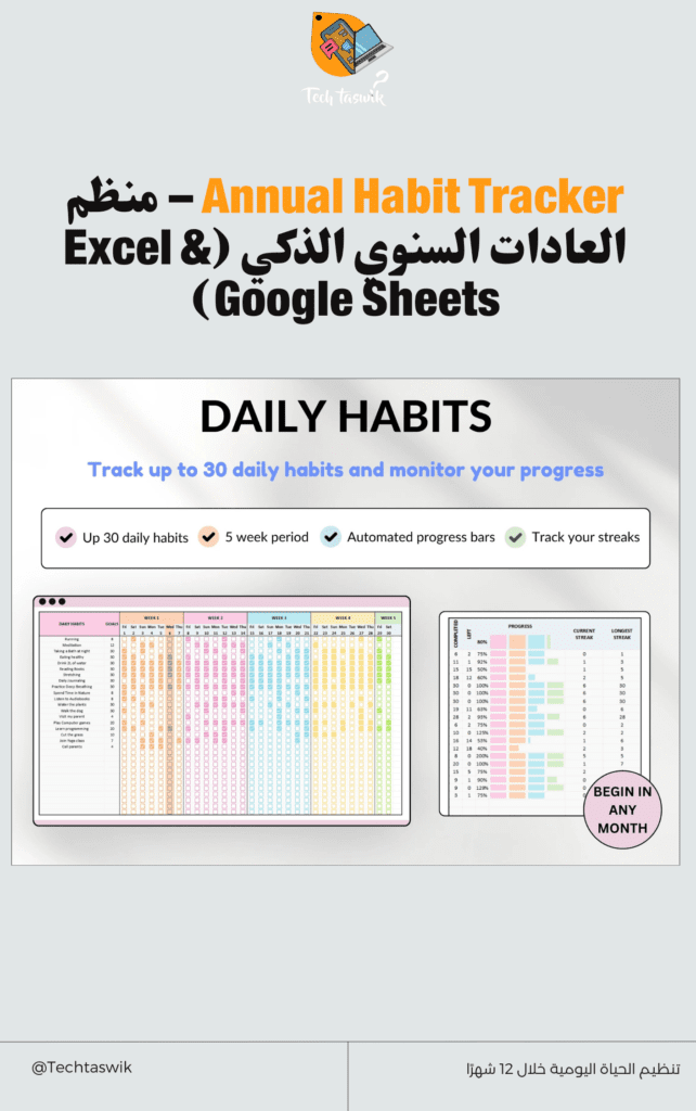 📥 حمل من هنا وتمتع بتنظيم وقتك ومتابعة عاداتك اليومية بسهولة: تحميل جدول تتبع العادات Excel وPDF
