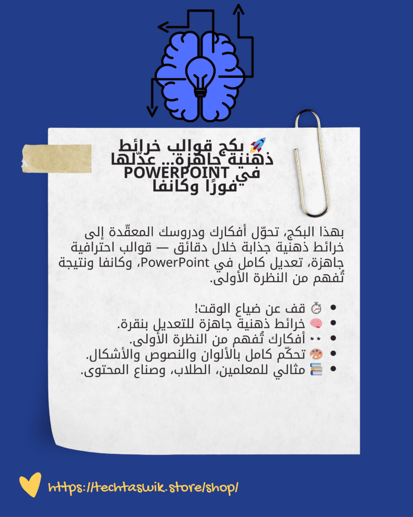 بهذا البكج، تحوّل أفكارك ودروسك المعقّدة إلى خرائط ذهنية جذابة خلال دقائق — قوالب احترافية جاهزة، تعديل كامل في PowerPoint، ونتيجة تُفهم من النظرة الأولى.