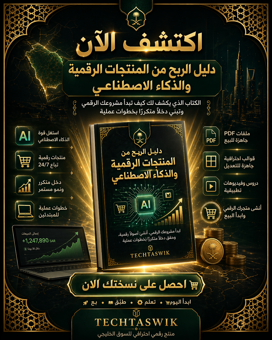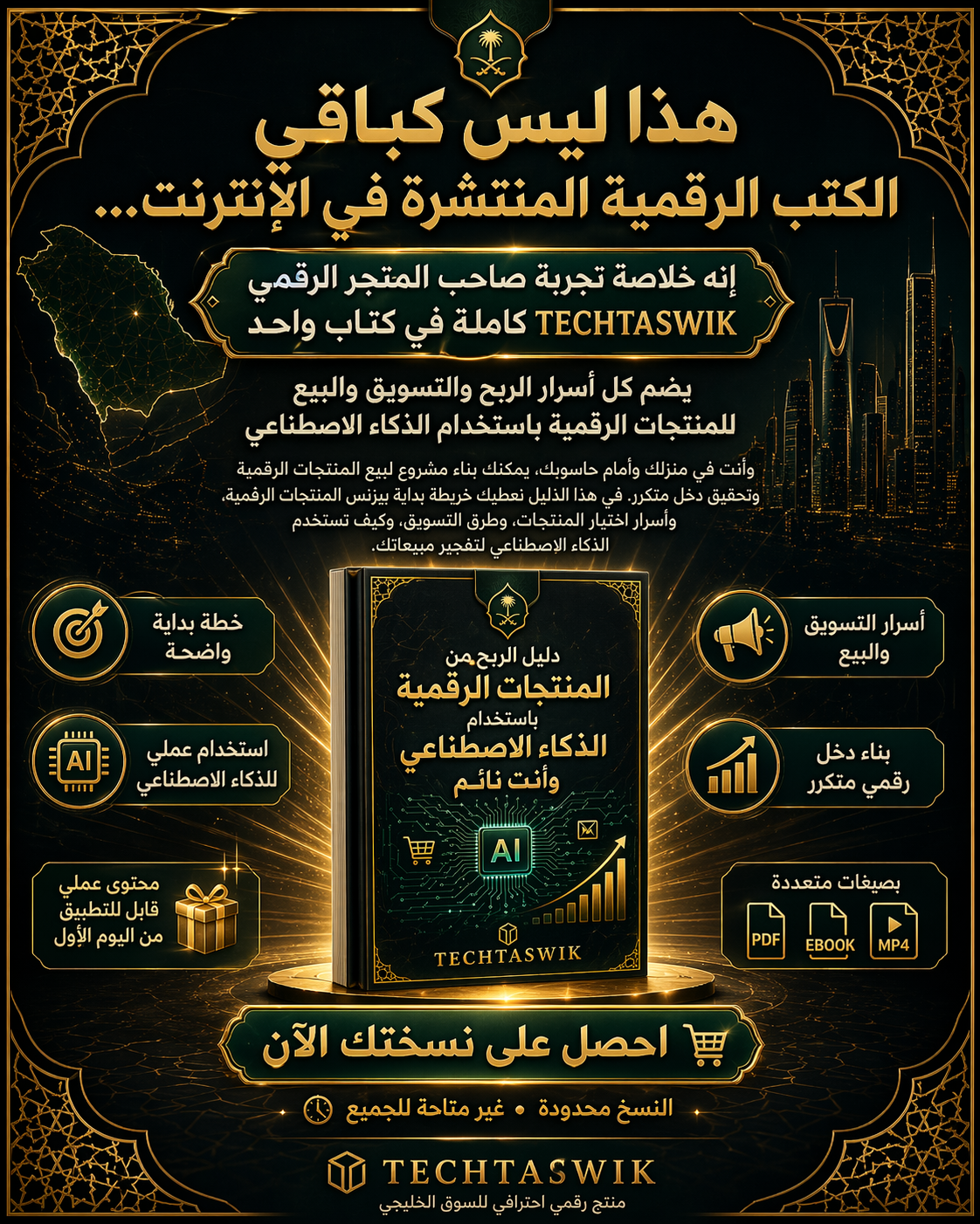 هذا ليس كباقي الكتب الرقمية المنتشرة في الانترنت… انه تجربة صاحب المتجر الرقمي TECHTASWIK كاملة في كتاب واحد يضم كل اسرار الربح والتسويق والبيع للمنتجات الرقمية باستخدام الذكاء الاصطناعي.